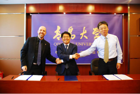 图为现任山东省教育厅厅长、党组书记、山东省教育工委常务副书记,时任青岛市市委常委、市委高校工委书记、市教育局党委书记、局长、市总工会主席邓云锋(中),加拿大女王大学教务长、副校长Benoit—Antoine Bacon(左),青岛大学党委常委、副校长于永明(右)代表三方签署合作共建研究院框架协议。(The representatives of the three parties signed a framework agreement for cooperation and joint research)