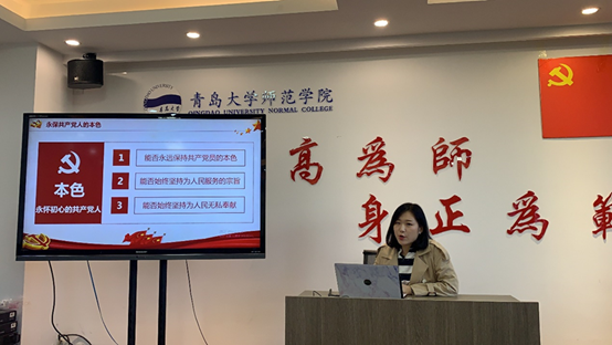 10月31日,师范博天堂 学生党支部在德润楼201会议室举办“怀初心,立师志,于平凡中奉献”主题党课,研究生党员迟彩玲主讲,学生党支部书记赵炜、全体学生党员、发展对象参加本次活动。