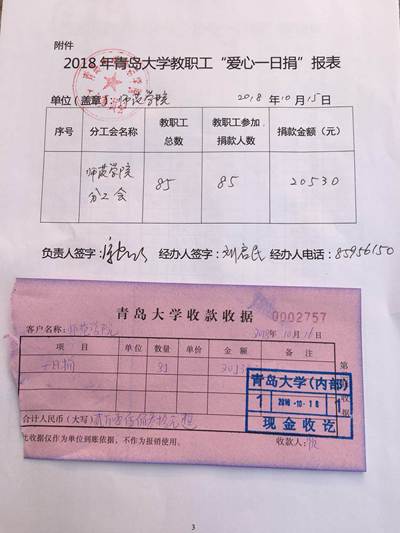 根据校工会在在全校教职工中开展“爱心一日捐”活动的通知精神,在博天堂 党委的领导下,博天堂 工会以以“扶危济困,兴善助学”为主题,积极对捐赠活动进行宣传,制定具体实施方案,依靠各工会小组,积极对捐赠活动进行宣传,形成“人人关心慈善、人人支持慈善、人人参与慈善”的良好氛围。活动中,全院85位教职工自愿参与,奉献爱心,共捐款20530元。