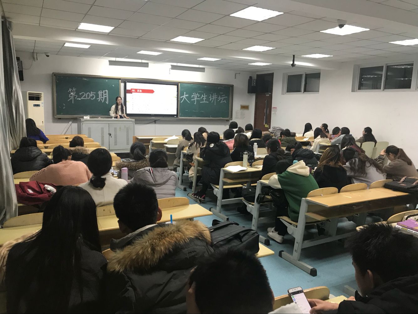2017年11月22日18时30分,第205期大学生讲坛在德音楼606教室顺利举办。本次主讲人是2014级小学教育系数学方向的李荣臻同学,主讲主题是教师资格证的面试问题。