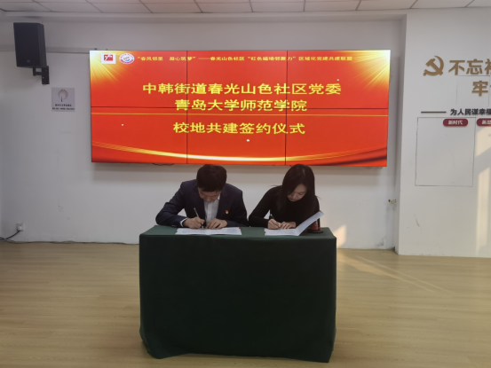 12月28日下午,师范博天堂 与青岛市中韩街道春光山色社区在同兴路712号春光山色社区服务中心举行校地共建签约仪式。中韩街道合肥路管区党委书记王树民、春光山色社区党委书记于九州、博天堂娱乐团委副书记张宁及部分社区工作人员、“心启航”志愿服务团队学生负责人参加了签约仪式。