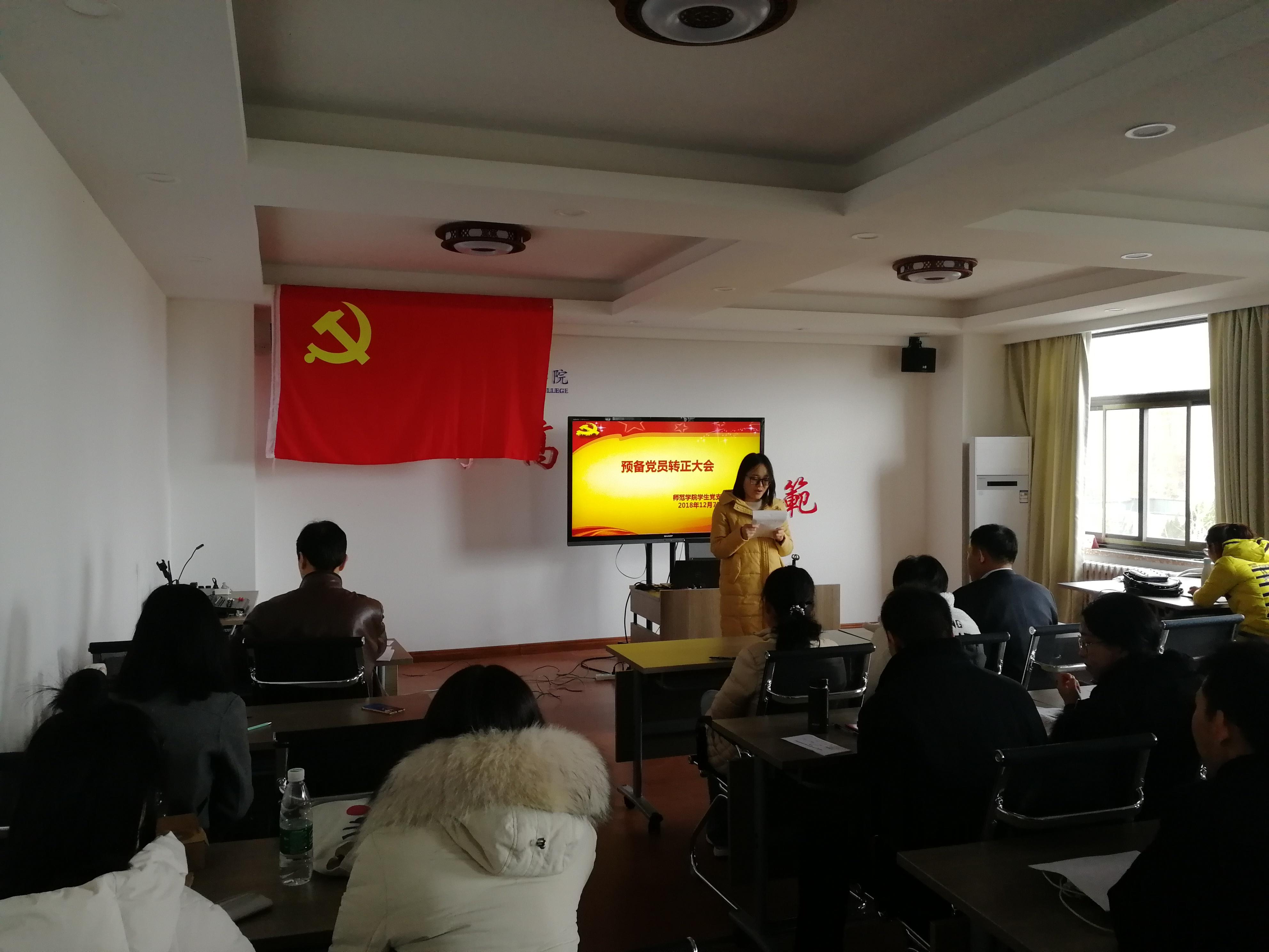 2018年12月7日中午,师范博天堂 学生党支部在德润楼201会议室召开了预备党员转正大会,会议由学生党支部书记赵炜主持。会议研究讨论了张乔、弋草两名中共预备党员的转正申请,并通过无记名投票的方式进行表决,一致同意张乔、弋草两名同志按期转为中共正式党员。