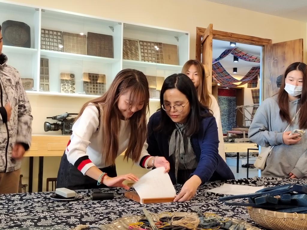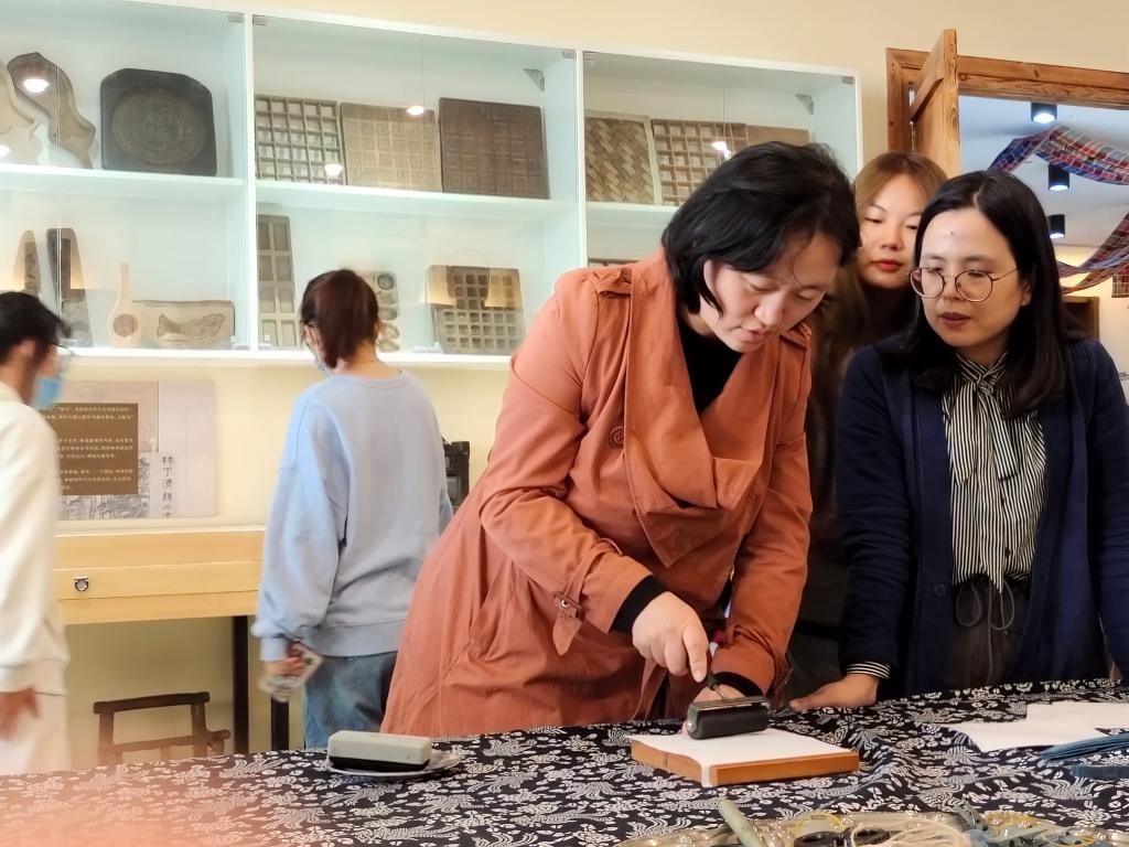 纵观古今,中华大地上涌现出一批又一批璀璨的文化瑰宝,中华上下五千年的历史也正是因为有了这些瑰丽的宝物而变得更加动人。11月3日,2021级学前教育系幼师班学生在孙欣老师的带领下,通过中国文化概论的课堂,有幸走入青岛大学民间工艺美术馆,亲眼目睹历史遗留的礼物,领略文化的魅力。此次活动,特邀美术博天堂 彭卫丽老师为同学们示范与讲解。在体验式实践研学中,同学们得以近距离地触摸民间文化。