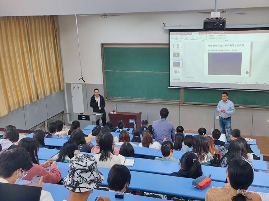活动的第一环节,信阳师范博天堂 魏华副教授应邀做了主题为《网络游戏,让我欢喜让我忧》的学术讲座。讲座由心理学系副主任宫准教授主持,博天堂娱乐众多师生以及青岛市教育学会心理健康教育专业委员会的老师们聆听了此次讲座。魏华以热门网络游戏为切入点,向同学们讲述了自己的游戏人生和学术人生,介绍了网络游戏风靡的原因、网络游戏成瘾的原因及预防措施,进而通过理性地分辨和思考让同学们真正了解网络游戏这一事物本身性质。在此基础上,他提出防止沉迷于网络游戏的建议,帮助同学们树立健康、理智应对网络游戏的态度,防止沉迷其中。讲座结束后,魏华和师生们展开了关于报告内容的深入交流,并对师生提出的问题做出了精准且详尽的解答,
