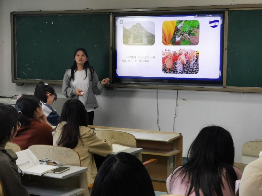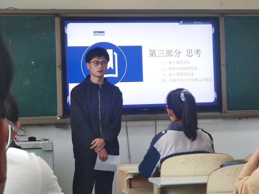 本次经验分享的主题是“乡土教材开发的实践与思考”,团队成员刘丹、周婧、刘庆宇分别就乡土教材开发的前期准备、正式编写与理论思考向同学们进行详细介绍。