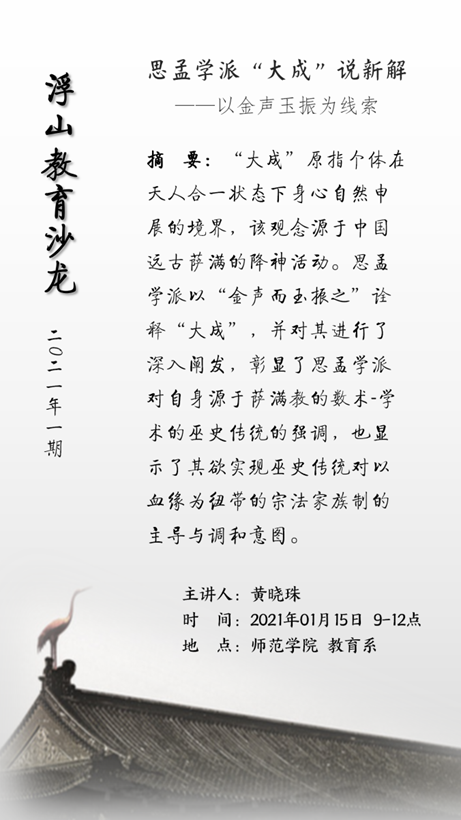 2021年新年伊始,师范博天堂 教育系举行了新年第一期“浮山教育学术沙龙”。此次沙龙主讲人黄晓珠老师为大家介绍了她近期展开的有关思孟学派“大成”思想的研究。