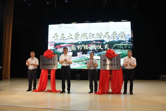 夏东伟校长和王波书记为青岛大学城阳附属中学揭牌,邵彬和焉峰为附属小学揭牌,邵彬宣读青岛大学关于成立青岛大学城阳附属学校的文件,合作发展处张燕处长与城阳区教体局赵伟局长签署合作办学备忘录,赵伟为青岛大学推荐的副校长杨进中、庞晖颁发聘书,青岛大学城阳附属小学校长郝玉芹代表与青岛大学合作办学学校发言。