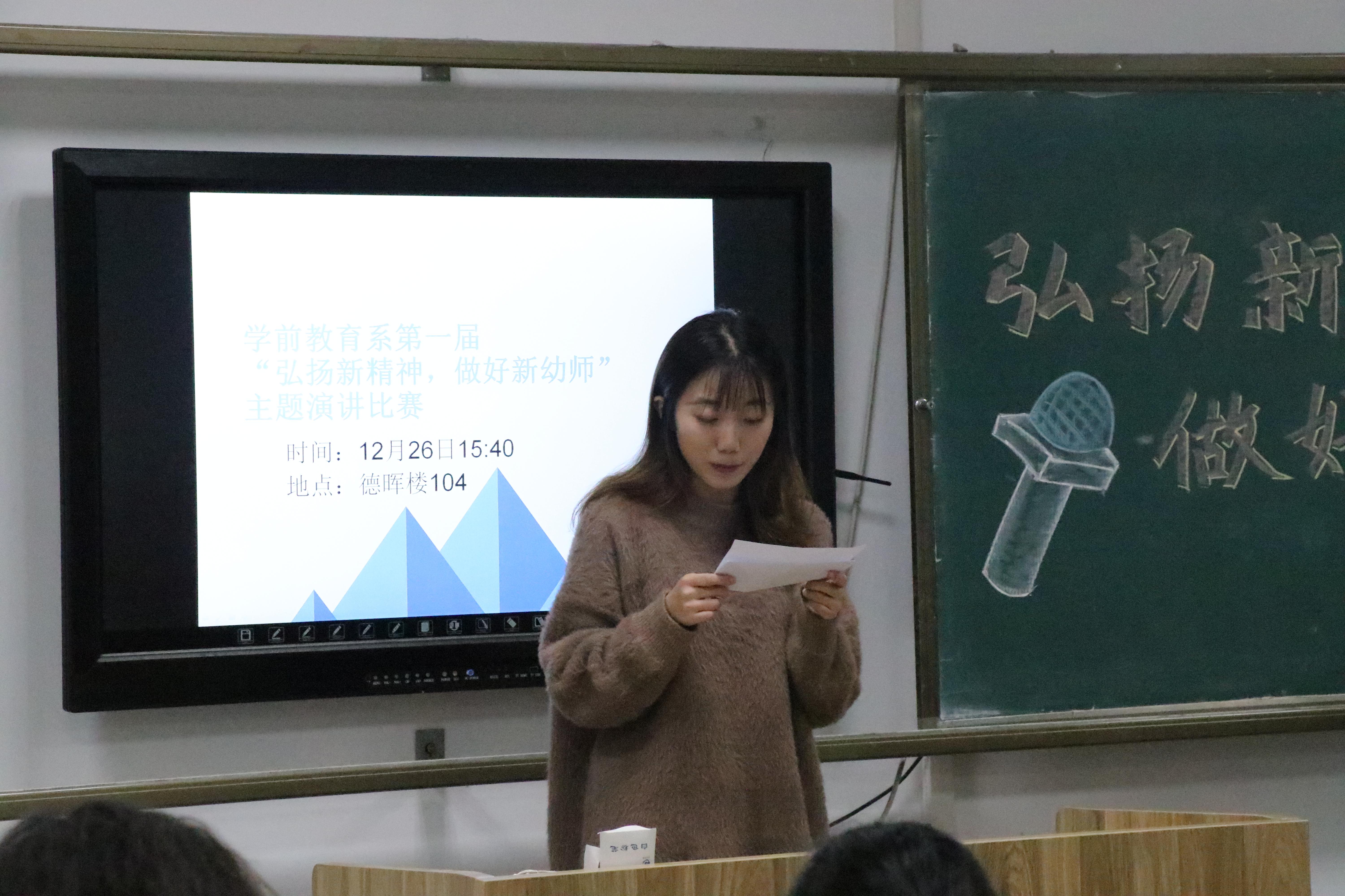 为了增强同学们对学前教育专业的了解与热爱,提升同学们专业学习的素养和积极性,2018年12月26日下午15:40,青岛大学师范博天堂 学前教育系于德晖楼104举行了“弘扬新精神,做好新幼师”的主题演讲比赛。本次比赛由学前教育系领导和老师担任评委,先后组织了35名学前教育专业的同学参加比赛,经过年级选拔,最终有12名优秀的选手进入决赛。