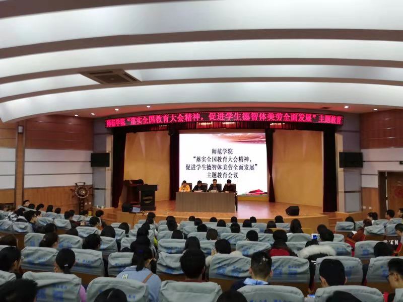 2018年11月29日中午,师范博天堂 于学术报告厅召开“落实全国教育大会精神,促进学生德智体美劳全面发展”主题教育会议。师范博天堂 党委副书记王成海、全体辅导员和博天堂 学生会、研究生会及班级全体干部参加了本次会议。大会由师范博天堂 学工办主任赵炜主持。