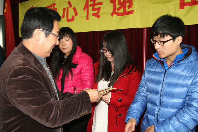 仪式在庄严的国歌声中开始,万宗喜副书记、姬彪先生分别作了热情洋溢的讲话,希望能通过这种活动,传递正能量,助学成才,把这种无私奉献的精神传递下去。接着,全体人员观看了“爱的传递”视频。万书记宣读“醒狮”奖(助)学金获奖学生名单,并和姬彪先生、楚成东先生为获奖学生颁奖。随后,由获奖学生代表袁琳同学宣读“爱的传递,由我做起”倡议书,获奖同学自发地在爱心传递承诺书上郑重地签下了自己的名字。最后,在和谐融洽的气氛中,学工办赵炜主任阐释了“醒狮”精神,鼓励大家取之社会,回馈社会。
