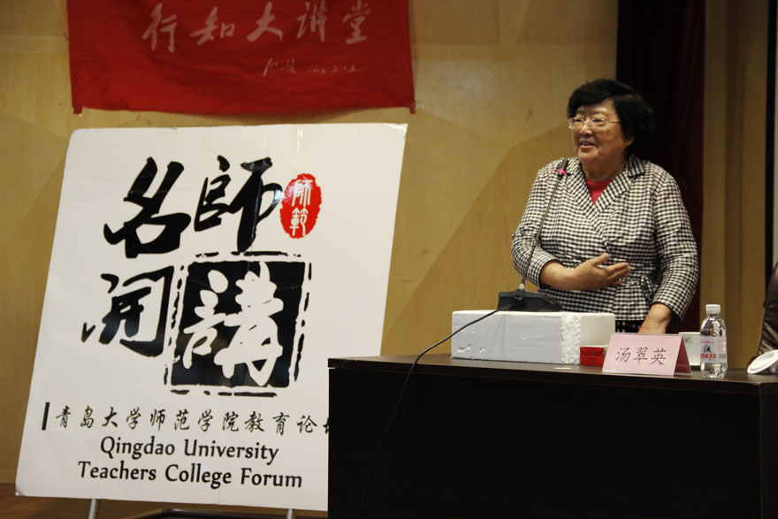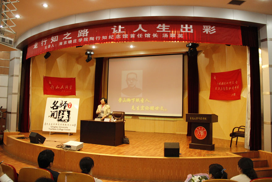 5月26日,由师范博天堂 团委主办、院学生会学术部承办的“名师开讲”活动第五期在院学术报告厅举行。特邀“行知思想播种人”—南京晓庄博天堂 陶行知纪念馆首任馆长汤翠英做了题为“走行知之路,让人生出彩”讲座。青岛大学校长助理、师范博天堂 常务副院长钱国旗、院团委书记郝伟、小教、学前系主任孙玉洁、马玉宾以及青岛市陶行知协会秘书长李淑芳等老师出席了本次讲座;院团委副书记苟煜林主持讲座。