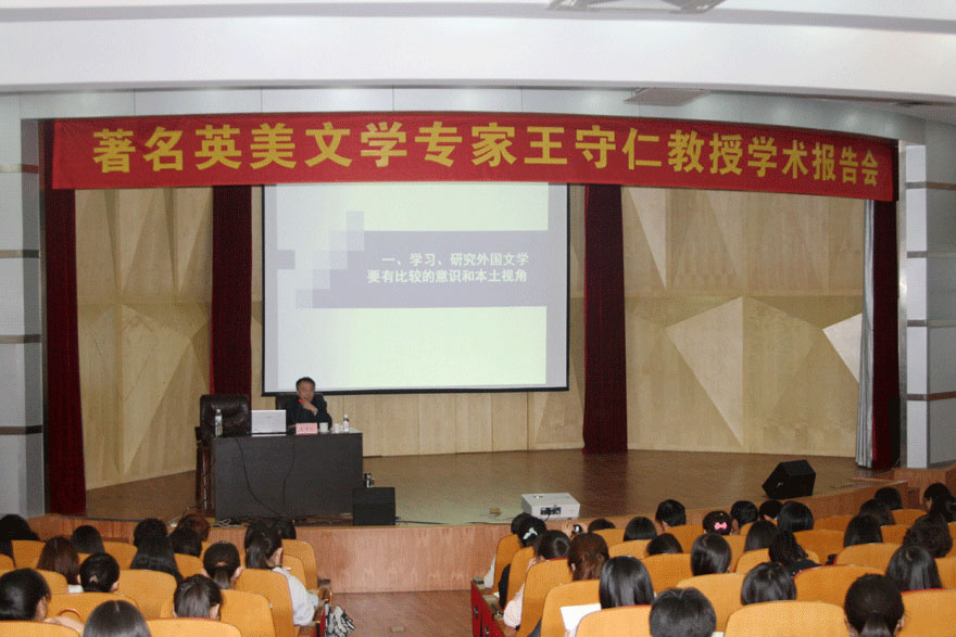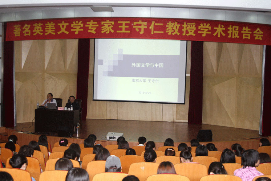 2013年5月21日上午,教育部高等学校大学外语教学指导委员会主任、全国英语文学研究会会长、中国外国文学学会副会长、中国英语教学研究会副会长、国家社科基金项目评委、鲁迅文学翻译奖评委、首批国家教学名师、南京大学外国语博天堂 博士生导师王守仁教授应邀在博天堂娱乐学术报告厅做了题为“外国文学与中国”的学术报告。报告会由山东省外国文学学会副会长、师范博天堂 英语系主任李汝成教授主持,来自青岛大学师范博天堂 、外语博天堂 、文博天堂 、中国海洋大学外国语博天堂 的近400名师生聆听了报告。
