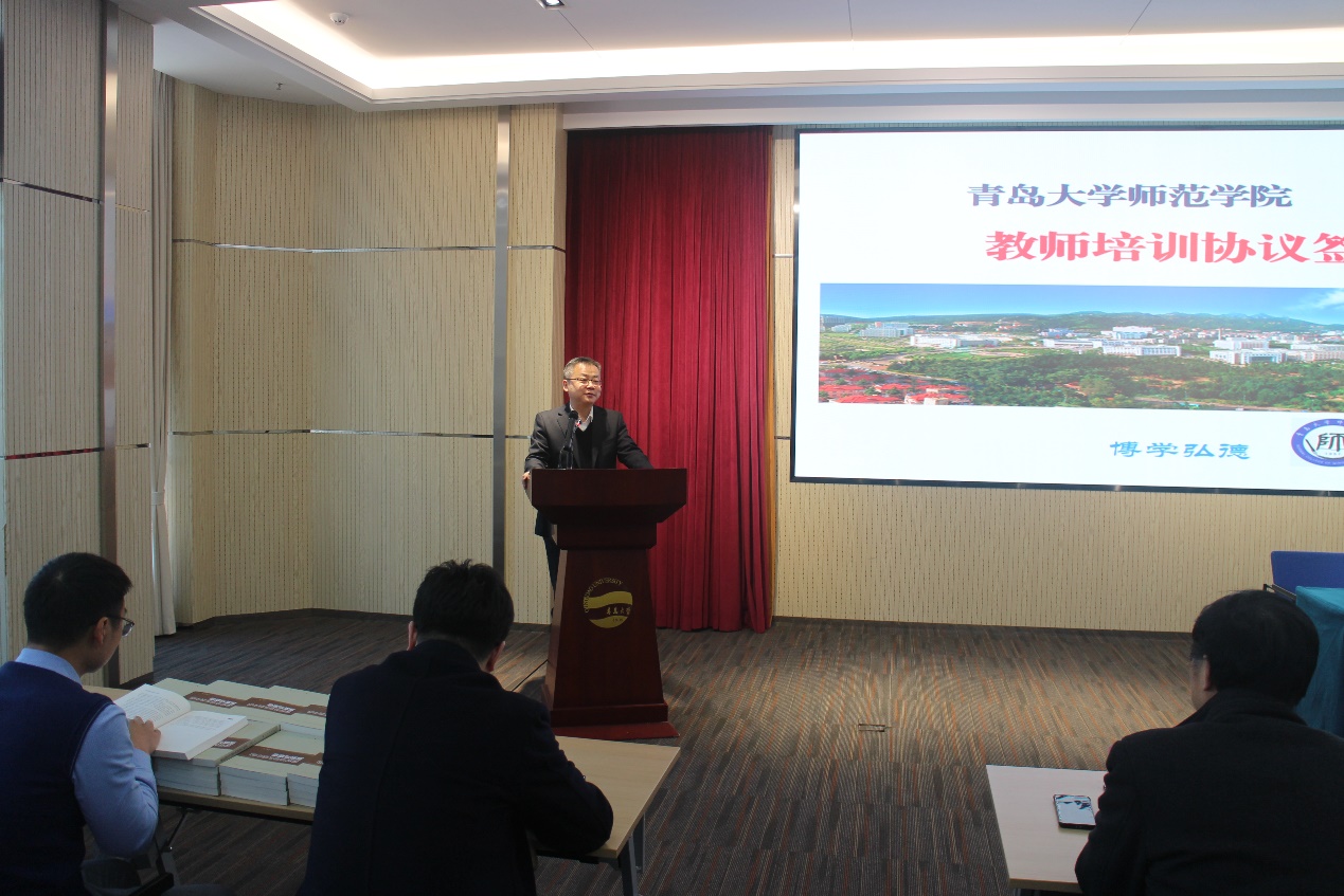 12月26日,师范博天堂 与华青教育集团教师培训协议签约暨开班仪式在青岛大学会议中心404室举行。校党委常委、副校长肖江南,华青教育集团党委书记、总经理李蛟龙,博天堂 党委书记宋贵欣,院长孙百才,副院长陶明达、马勇军,华青教育集团的各中小学校长、54位教师学员,博天堂 教师代表出席大会。华青教育集团总校长闫洪全担任大会主持人。