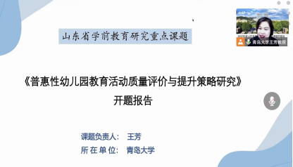 会议由青岛市教育局学前教育处处长李毅主持。课题负责人王芳教授代表课题组报告了重点课题《普惠性幼儿园教育活动质量评价与提升策略研究》和学前教育基地建设项目《幼儿园游戏案例“做-研-写-用”四位一体研修模式的构建与应用》的研究设计和主要实施路径。