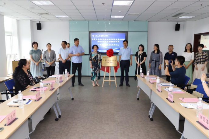 党委副书记夏锡梅教授、副院长陶明达教授与青岛第二十六中学教育集团京山校区党总支书记孙晓梅、青岛市第五十九中学副校长郭宗胜、青岛中学副校长胡春丽、青岛瑞阳心语心理学应用技术发展有限公司副总经理蒋洪林、青岛市精神卫生中心科教科主任王圣海、海军第971医院医学心理科主任宫婷、青岛市崂山区社会心理健康指导中心主任白晓璐、青岛文登路小学教导主任李莉,青岛宁德路小学科研主任韩敏等14个基地代表一起共同为实践基地揭牌,标志着实践基地正式落成。