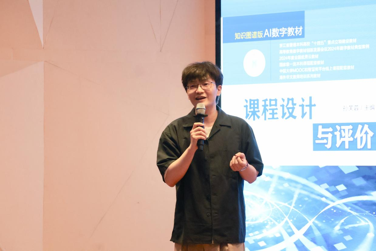 随后,李子涵从现代教育设计与评价的系统化整理、国际化拓展以及智能化呈现三个方面介绍了AI数字教材——《课程设计与评价》,并现场为同学们展示教材的主要功能和操作模块。