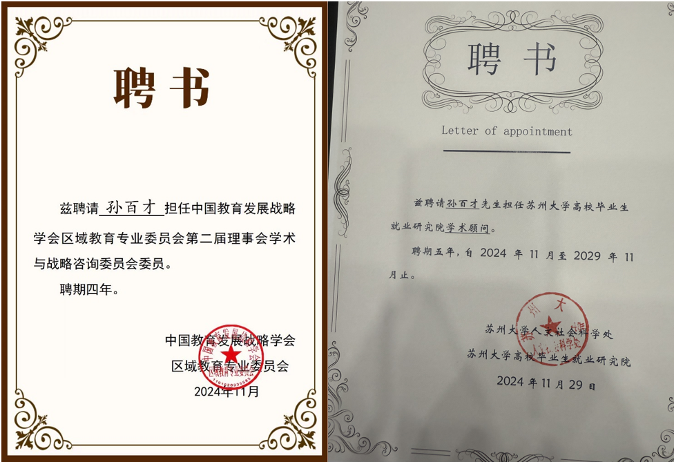 近日,“学习贯彻全国教育大会精神,推进区域教育高质量发展论坛”“面向强国建设的高校人才培养与就业促进”学术研讨会分别在哈尔滨和苏州召开,博天堂娱乐院长孙百才教授分别被聘为中国教育发展战略学会区域教育专业委员会第二届理事会学术与战略咨询委员会委员、苏州大学高校毕业生就业研究院学术顾问。