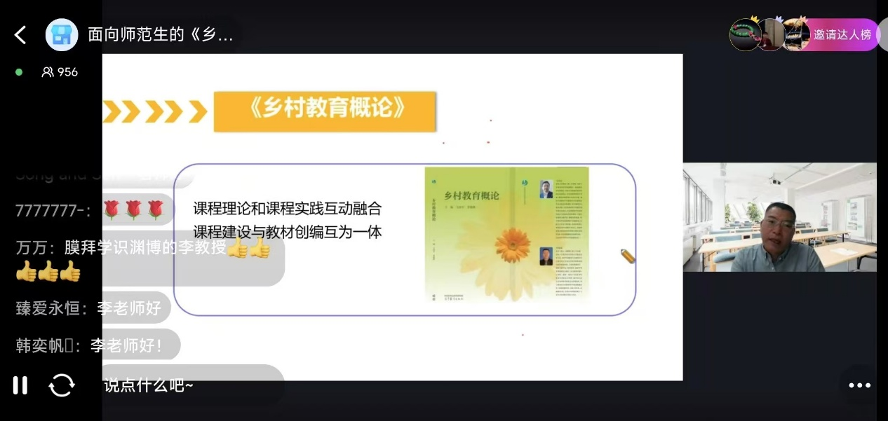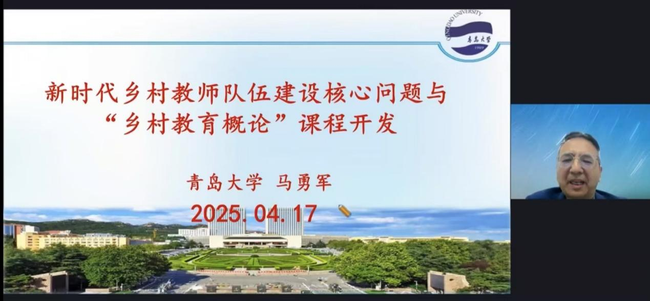 讲座的第一阶段,由马勇军教授进行以“新时代乡村教师队伍建设核心问题与‘乡村教育概论’课程开发”为主题的分享。马教授基于对乡村教师队伍建设现状调查、公费师范生培养高校调研和公费师范生未来素养分析,提出公费师范生培养中乡村教育知识能力和情怀的缺失问题,并介绍了联合8所省属高校组成联合开发团队,通过虚拟教研室和边试教边改进方式研发乡村教育概论课程与教材的经历,对课程目标设定与内容体系进行了讲解。同时,分享了课程实施的成效与取得的相关成果。