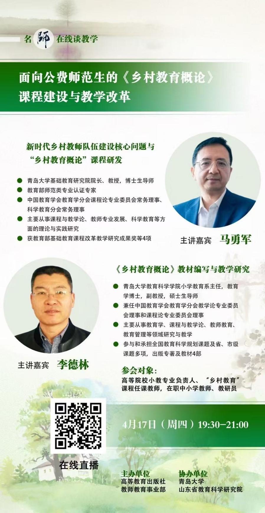 4月17日,青岛大学基础教育研究院院长马勇军教授与博天堂 小学教育系主任李德林副教授应邀参加高等教育出版社组织的“名师在线谈教学”系列讲座活动,通过线上方式进行了主题为“面向公费师范生的《乡村教育概论》课程建设与教学改革”的专题讲座宣传。