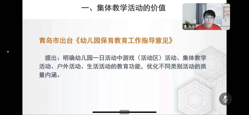朱泳首先从幼儿园集体活动的价值开始,告诉了同学们幼儿园集体活动的重要性,集体活动是幼儿园教学中必不可少的。她倡导大家要在设计集体活动时,遵从《3-6岁幼儿学习与发展指南》,利用正确的理论去引导实践。