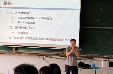 本次报告以“核心素养背景下信息技术与课程融合创新路径”为主题,主要从学习设计、核心素养内容、核心素养导向的信息技术与教育融合创新之路径三部分展开。从信息技术与课程整合的三层障碍视角和认知负荷理论视角强调了设计创新的重要性,从课程标准的发展解读核心素养,从课程结构的变革和学习形态的创新阐述信息技术和教育的融合路径。报告中,杨进中副教授用生动的例子和丰富的学术内容为老师和学生们从课程、课堂、学校三个层面剖析了如何将信息技术融入课堂、课程和学校创新设计之中。