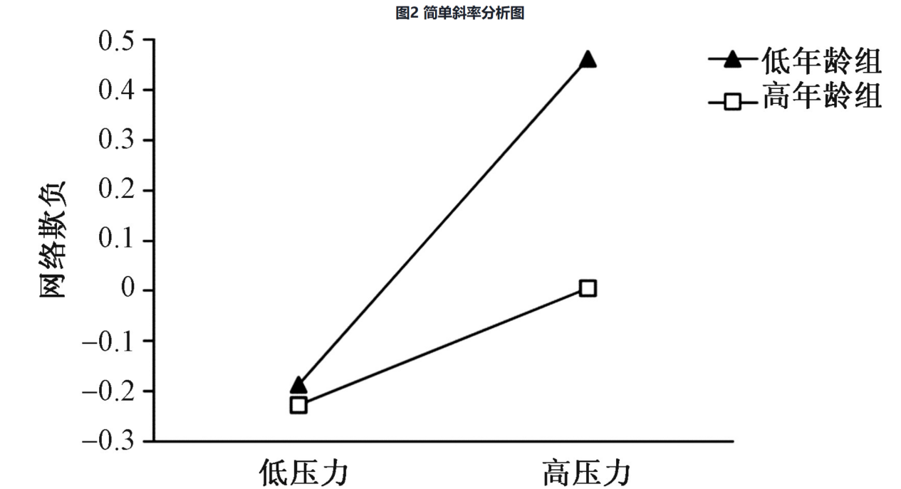 在SPSS 25.0中建立数据集,采用PROCESS宏程序进行数据分析,研究显示:父母低头行为正向预测网络欺负;父母低头行为显著正向预测压力,压力显著正向预测网络欺负;年龄负向预测网络欺负;压力和年龄的交互项负向预测网络欺负,说明有调节的中介效应显著。经过简单斜率分析,结果发现:无论是在低年龄组还是高年龄组,压力都可以显著正向预测网络欺负,但与低年龄组相比,高年龄组中压力对网络欺负的预测作用是减弱的。