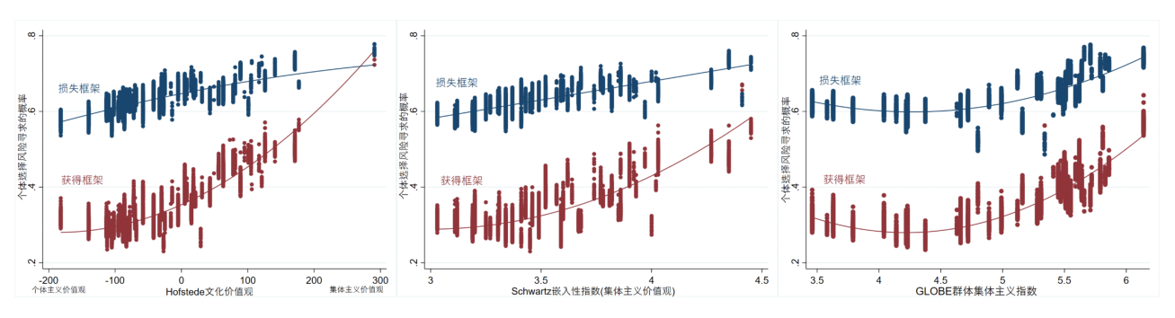 对不同框架类型(获得框架/损失框架)中文化价值观(Hofstede文化价值观/Schwartz嵌入性指数/GLOBE群体集体主义指数)与风险偏好进行分别建模分析,并绘制获得框架和损失框架中文化价值观与风险寻求的拟合曲线,均表明随着集体主义价值观的增强,个体选择风险寻求的概率越高。该发现支持软垫假说,即相较于个体主义价值观个体,集体主义价值观个体更风险寻求。本研究的结果与支持个体主义因过度自信而更敢于冒险的“硬汉假说”(tough guy hypothesis)并不一致,进一步扩大了软垫假说的适用范围。