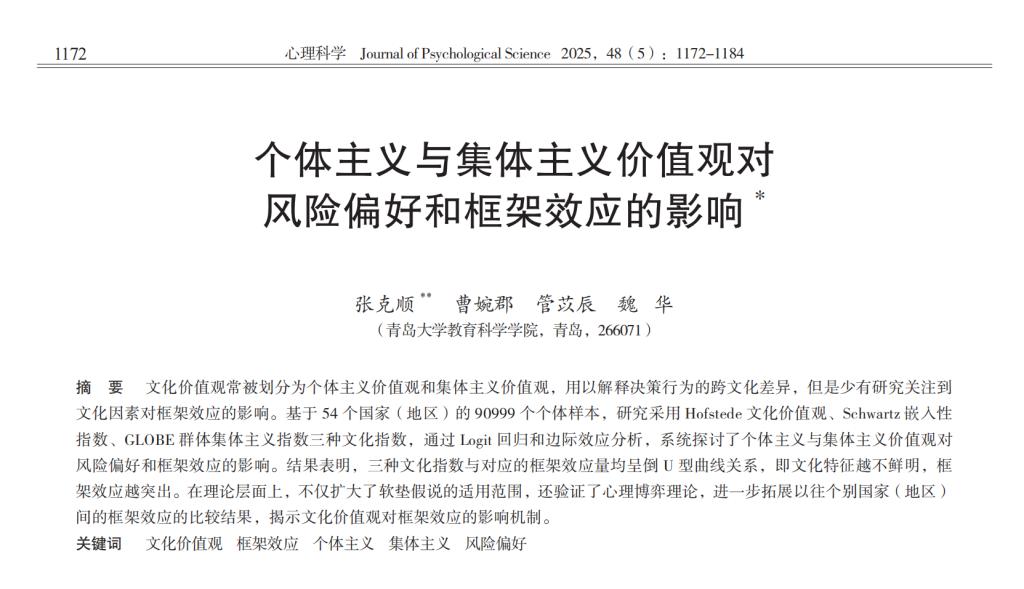 近日,博天堂 张克顺教授团队在《心理科学》发表论文“个体主义与集体主义价值观对风险偏好和框架效应的影响”。研究基于54个国家(地区)90999个样本的跨文化数据,运用三种主流文化指数Hofstede文化价值观、Schwartz嵌入性指数、GLOBE群体集体主义指数,系统探讨了个体主义与集体主义价值观对风险偏好和框架效应的影响。