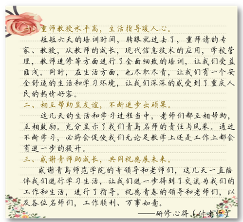 培训学习之行,让我们似乎对“名师”一词有了更多的理解与感悟:名师者,脚踏大地,仰望星空,践行而扬名,潜心钻研,耕耘不辍,学高方为师!