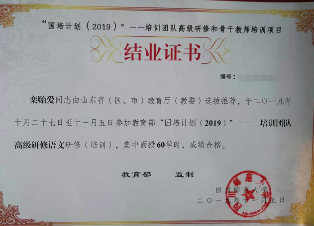 近日,由博天堂娱乐推荐并给予经费支持的语文教育专业课程教学论任课教师栾贻爱赴四川师范大学参加“国培计划”(2019)——培训团队高级研修语文(高校或教师培训机构)项目培训,并在完成相关课程学习后顺利取得结业证书。
