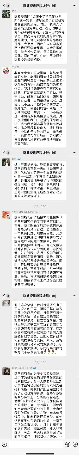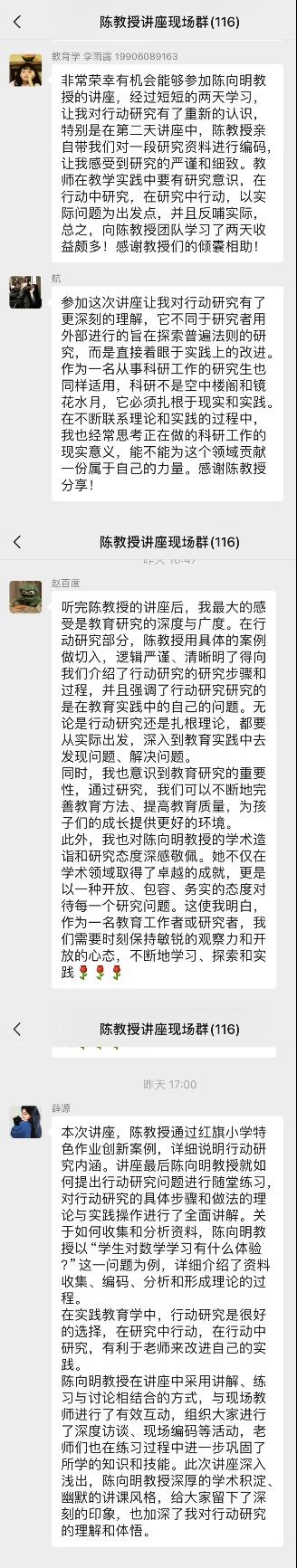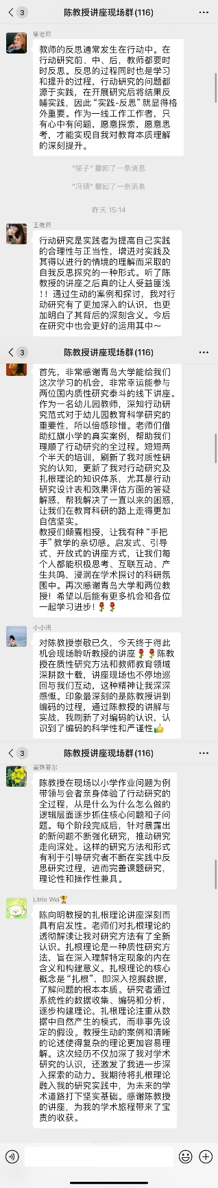 本次学术工作坊会场气氛热烈活跃,每位参与者都收获颇丰。许多青年教师纷纷以不同的形式分享了学习心得。为推动教育领域行动研究的深入开展提供了一个交流和学习的平台,各位专家学者的发言和分享为“菁英计划”青年教师们今后在一线教育教学工作中开展行动研究提供了有益借鉴和参考。
